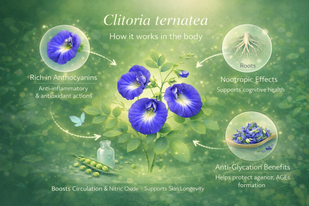 Discreet and elegant, Clitoria ternatea illustrates the idea of lasting health built on subtle but regular support. By contributing to cellular protection and mental clarity, it can be part of a holistic approach to longevity that prioritizes balance, gentleness, and consistency over the long term.